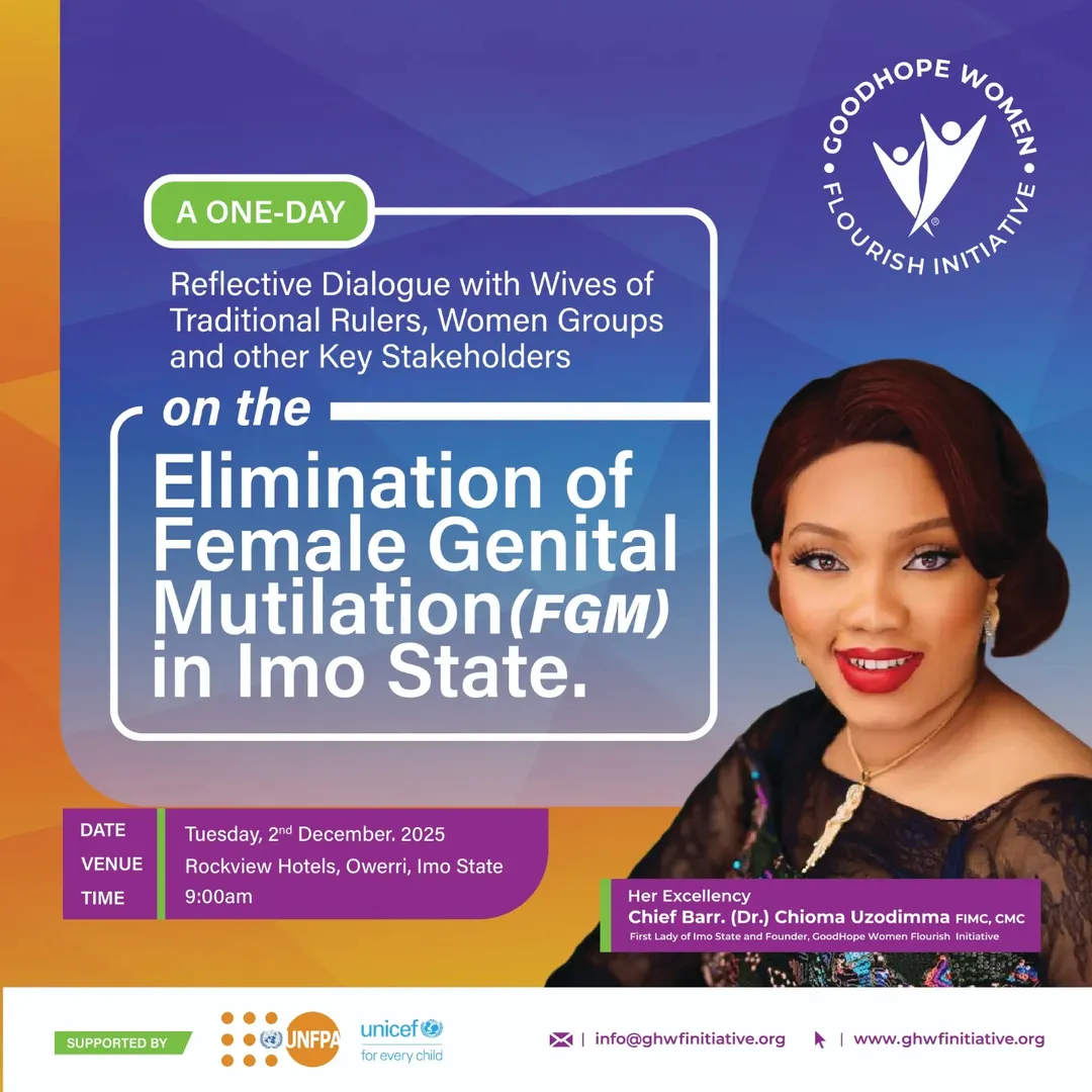 IMO FIRST LADY AND FOUNDER, GHWFI, BARR. CHIOMA UZODIMMA, TO LEAD HIGH-LEVEL INTERACTIVE STAKEHOLDERS’ DIALOGUE AGAINST FGM IN OWERRI ON DEC. 2, WITH SUPPORT FROM UNFPA AND THE IMO STATE MINISTRY OF WOMEN AFFAIRS